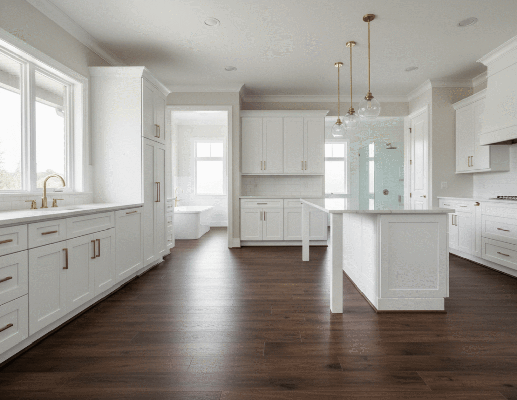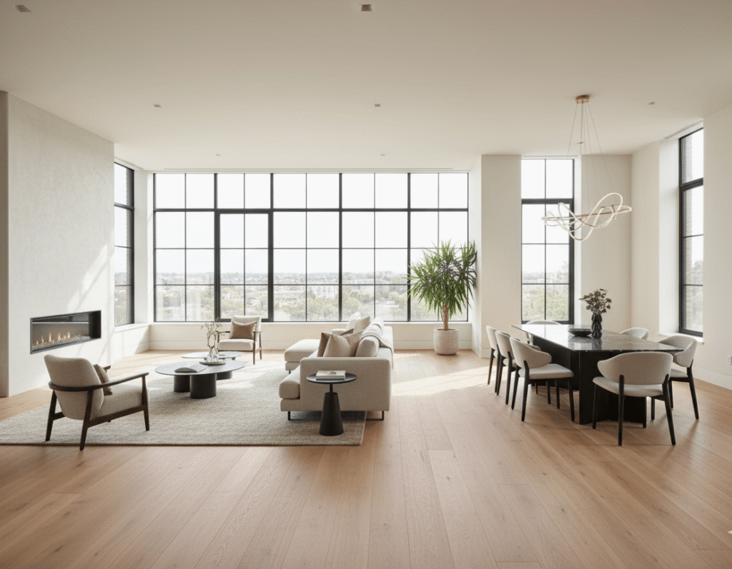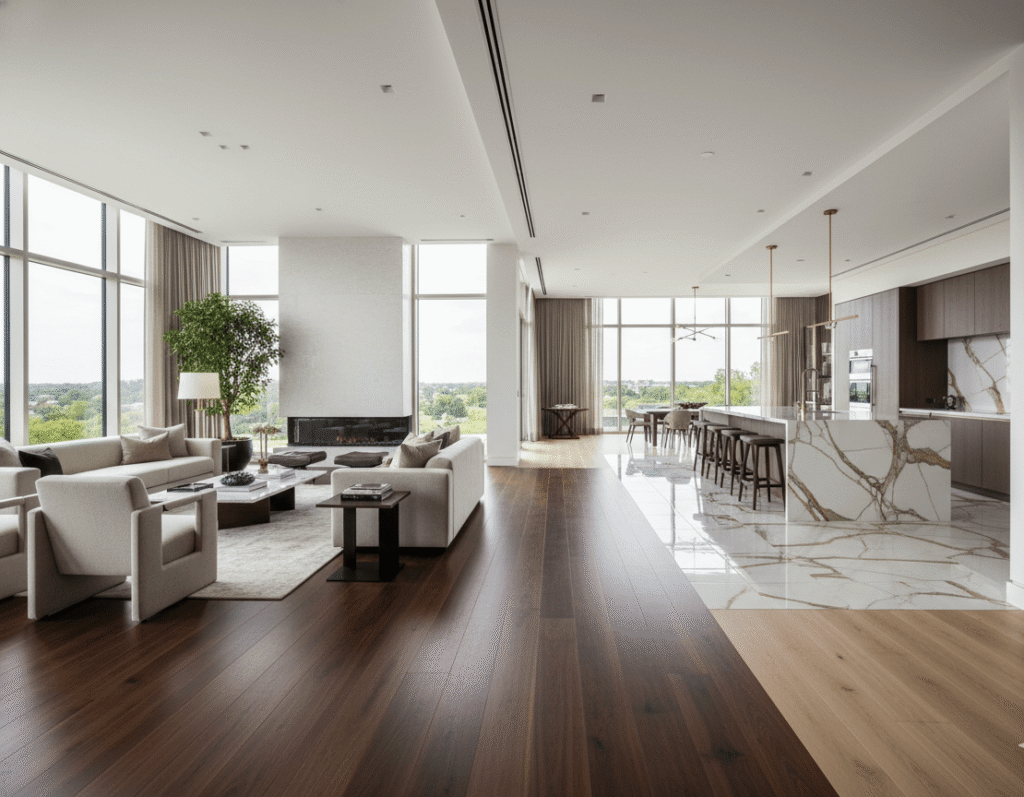 Wide Plank Hardwood – Larger planks create a contemporary, spacious feel. Modern aesthetic that works beautifully in open-concept homes.